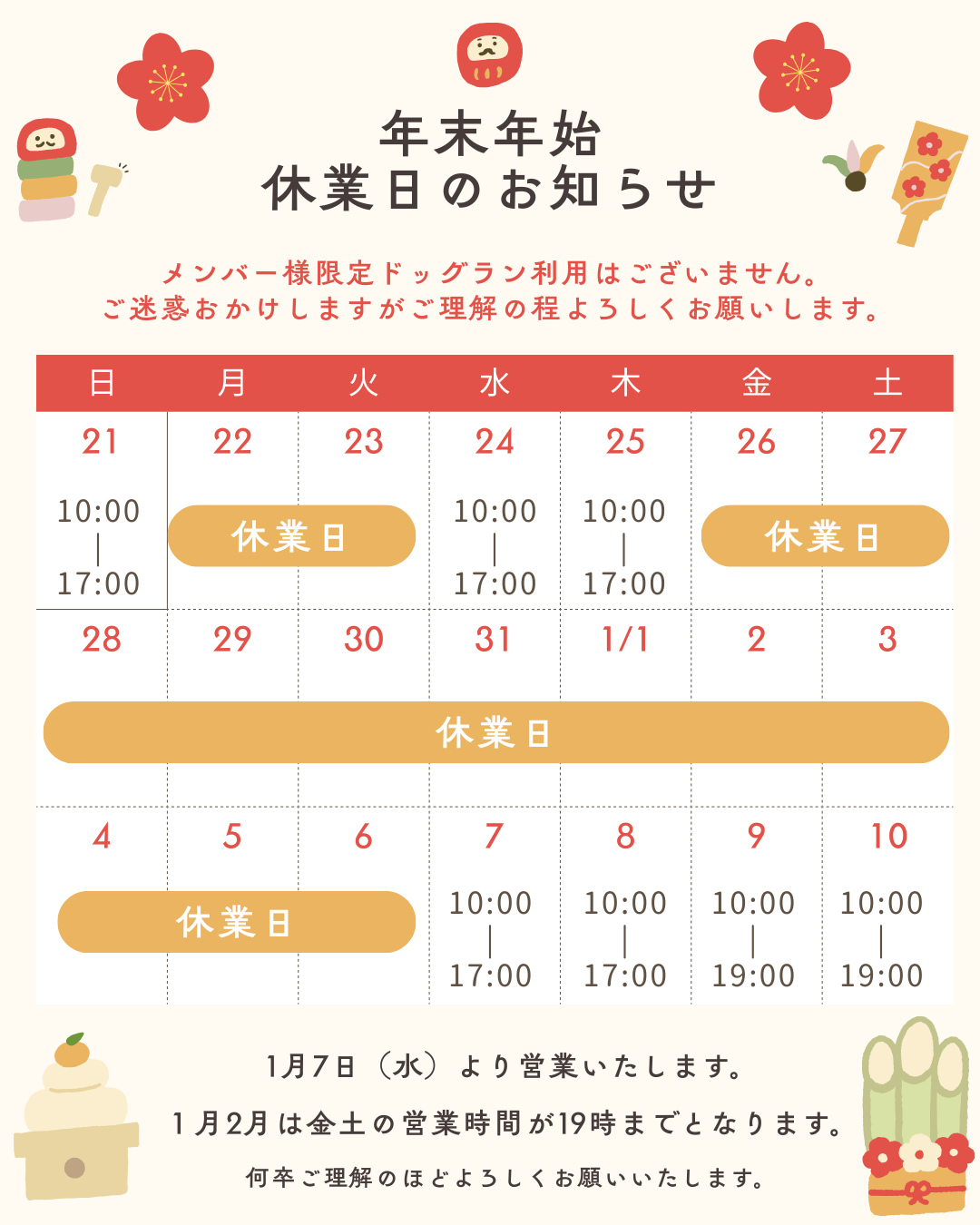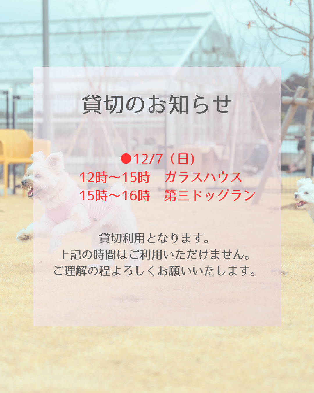 12/7(日) 12時~15時 ガラスハウス 15時~16時 第三ドッグラン が貸切利用となります。